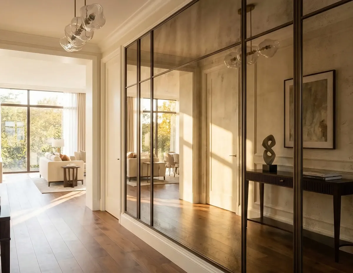 Large, uninterrupted mirrors visually double the size of a room, making tight hallways, compact bathrooms, or small home gyms feel expansive and airy.