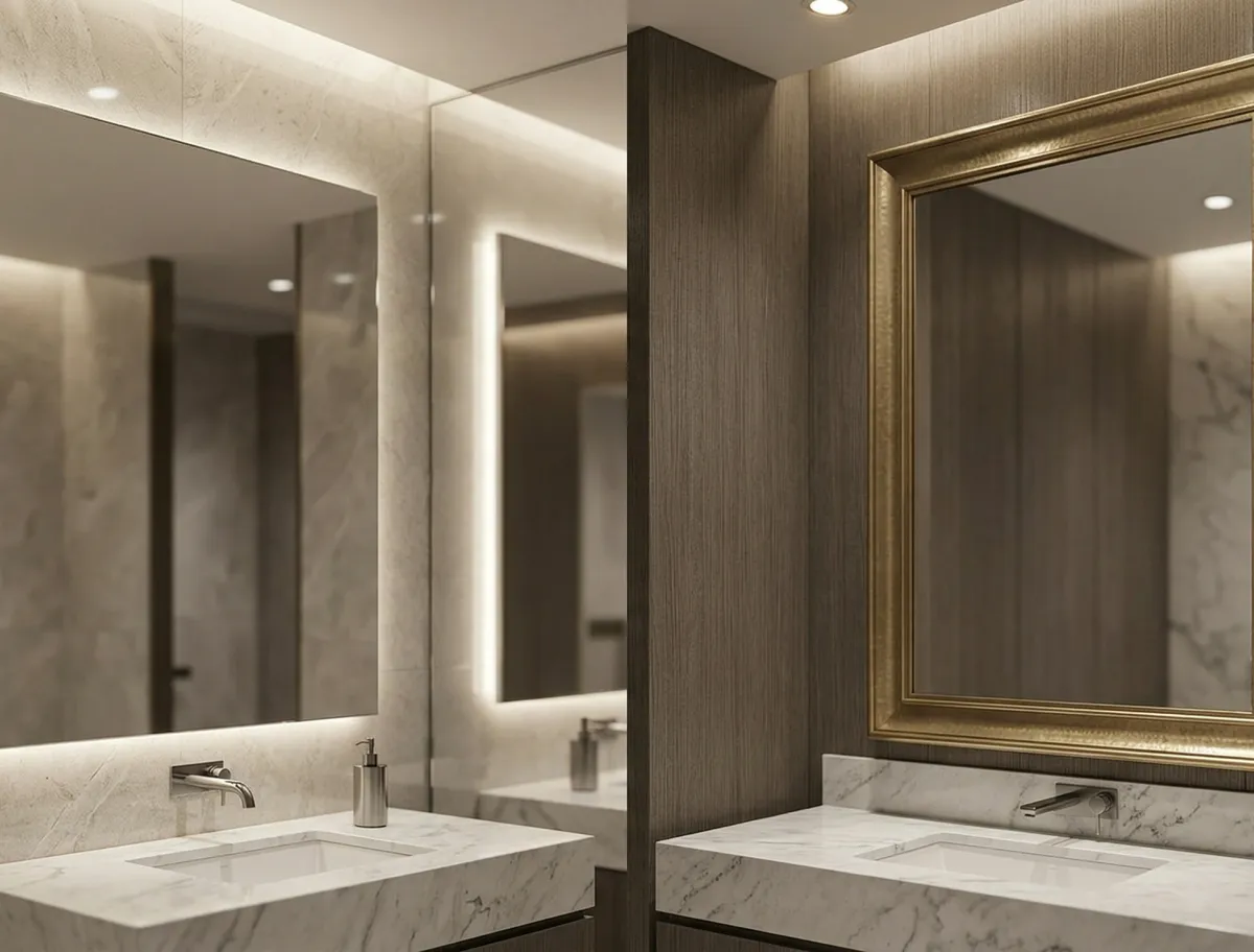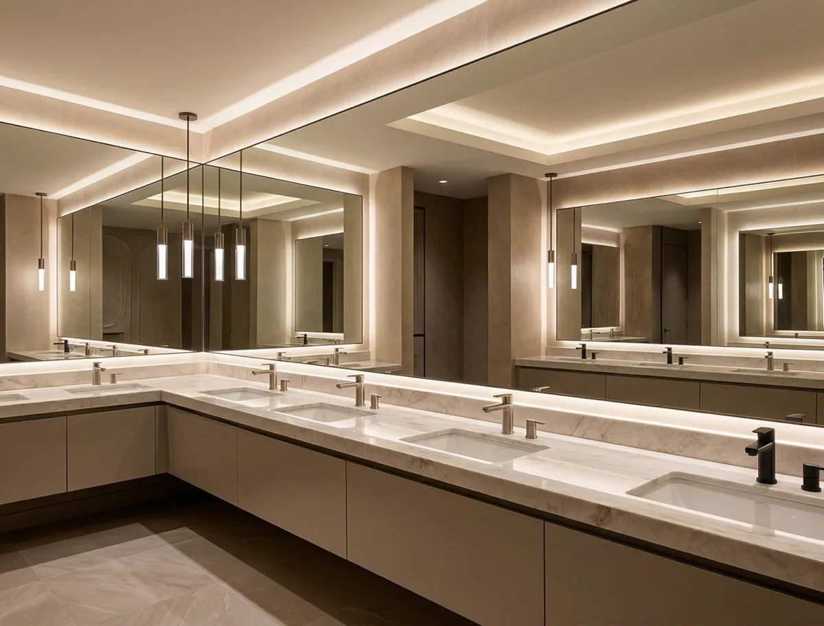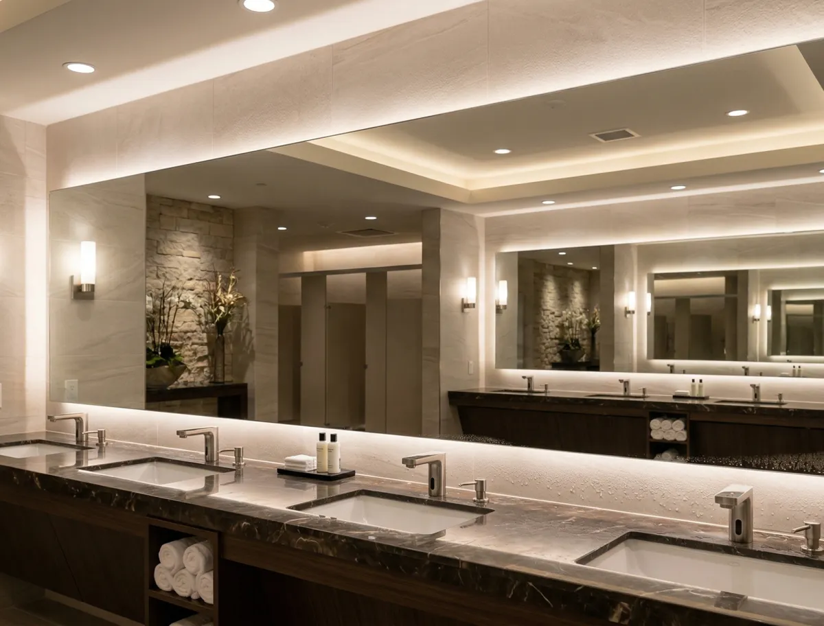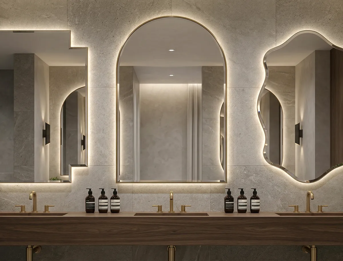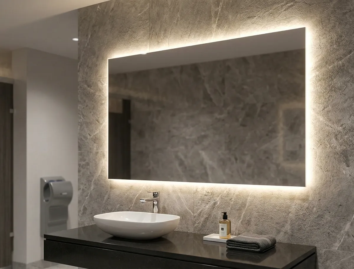 LED-backlit restroom mirrors create a modern aesthetic with soft perimeter illumination that reduces shadows, improves visibility, and allows adjustable dimming controls for precise ambiance.
