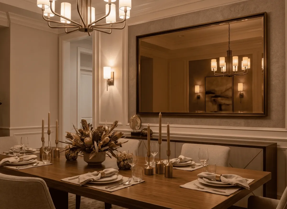 A dining room wall mirror placed in alignment with the table creates symmetry and balance within the space. Proper sizing ensures the mirror complements the table without overpowering it.
