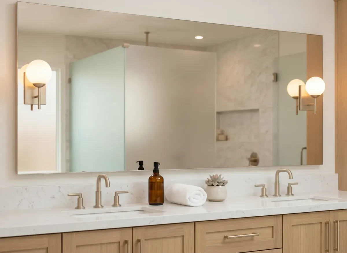 Retail mirrors often fail to match vanity width or wall dimensions. We fabricate bathroom vanity mirrors to ensure proper proportion and a clean, built-in appearance.
