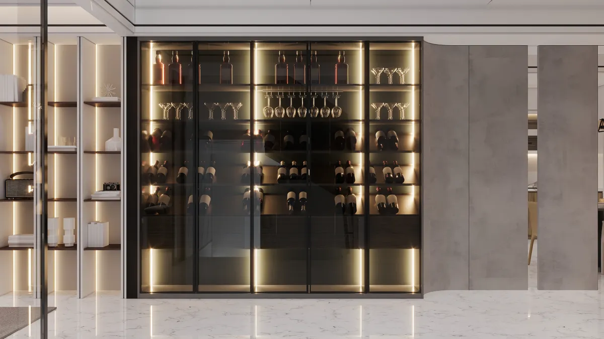 We typically use tempered insulated glass units (IGUs) with low-E coating for thermal efficiency. UV-protective glass is available to shield wines from light exposure, and we offer low-iron glass for maximum clarity.